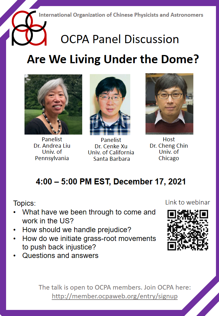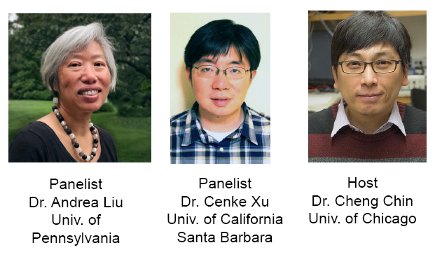 We are excited to announce the panel discussion by Dr. Cheng Chin from Univ. of Chicago, Dr. Andrea Liu from Univ. of Pennsylvania, and Dr. Cenke Xu from Univ. of California Santa Barbara.